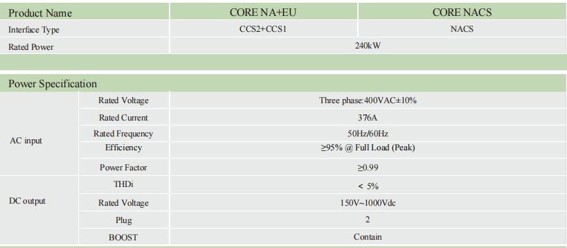 The Core  240kW Fast DC electric vehicle charger features a sleek, contemporary design with an intuitive user interface. Its modular construction ensures easy operation and simplified maintenance. Equipped with advanced functionality, it supports intelligent multi-charge operations and dynamic power distribution. It offers high-efficiency power modules, with a peak efficiency of ≥95% for the entire unit. Ideal for use in commercial plazas, charging stations, office buildings, and similar locations.